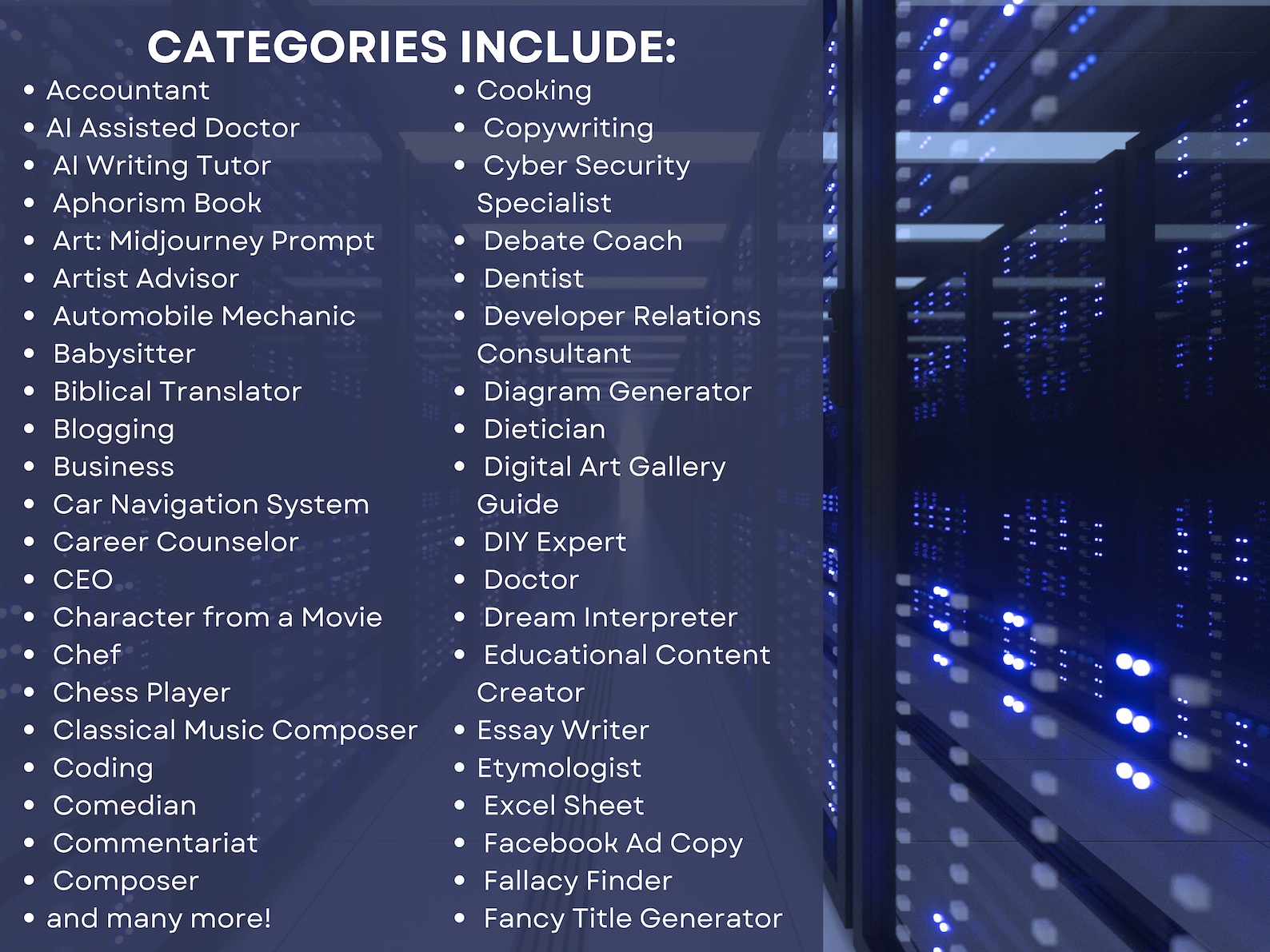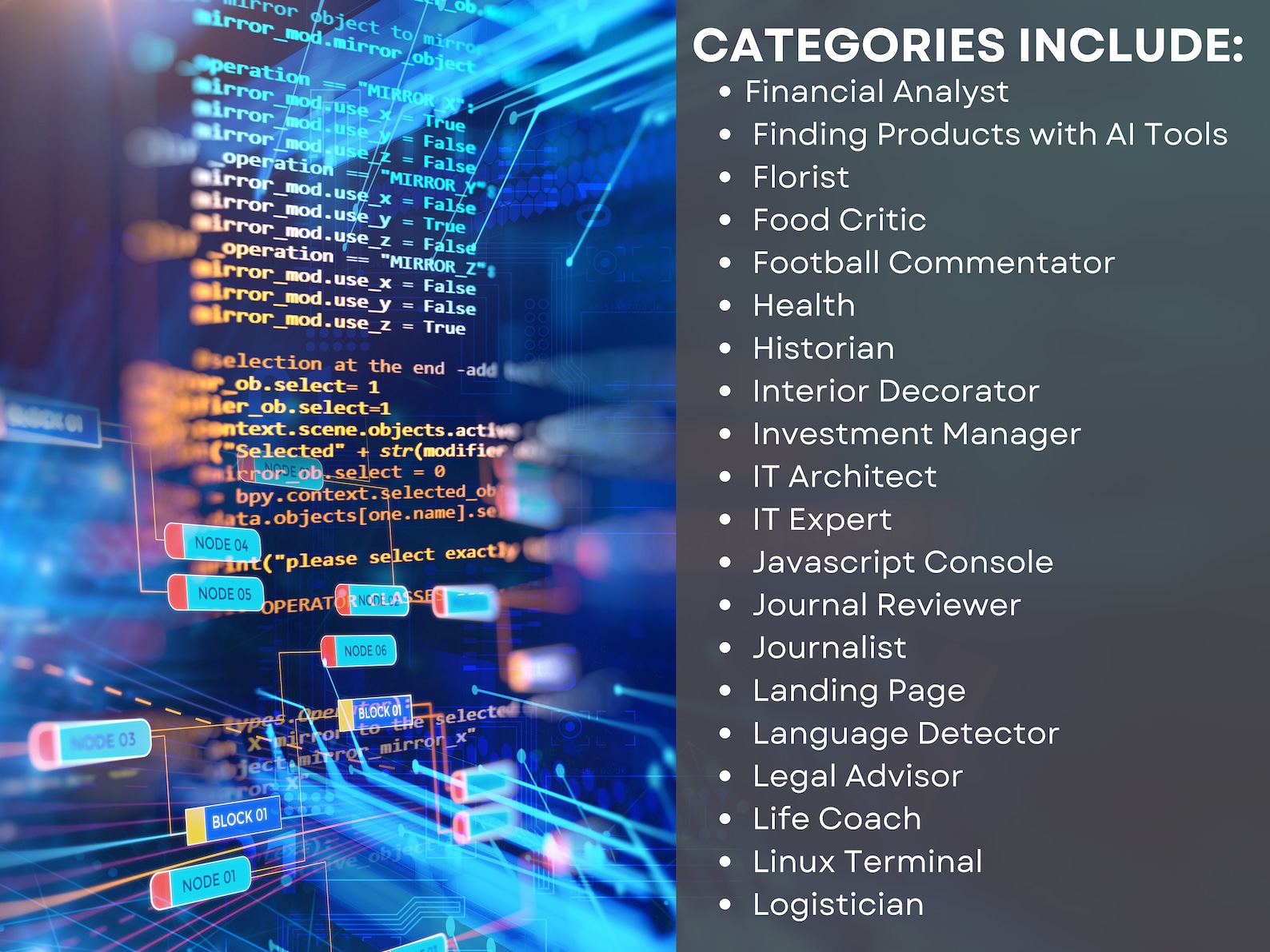Unlock the Power of ChatGPT: Welcome to the ultimate resource for mastering ChatGPT - our comprehensive collection of over 17,500 expertly crafted prompts across more than 720 diverse categories. Whether you're looking to enhance your personal life or accelerate your professional journey, this collection is your key to unlocking a world of knowledge and creativity with ChatGPT.